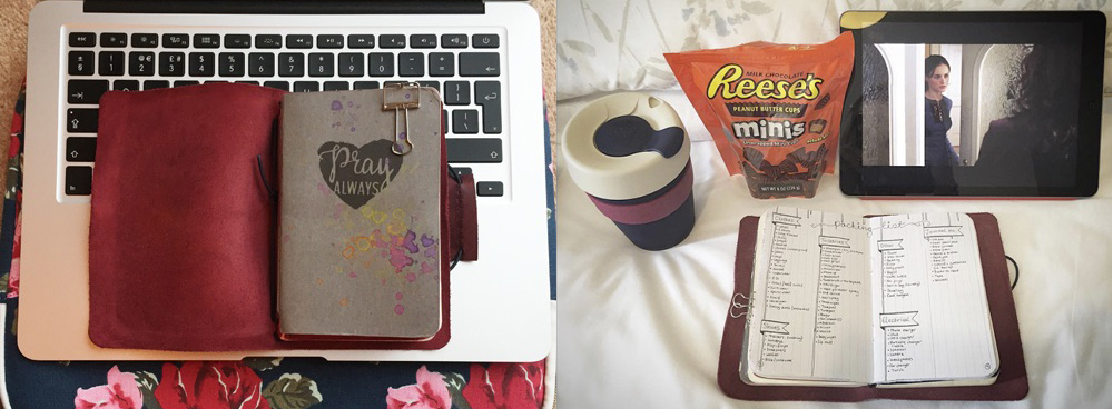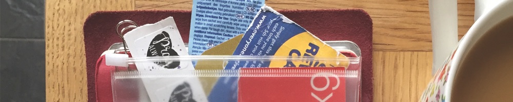 First up: a Pocket Prayer Journal…I always go for the hand painted ones! This is my ‘Jesus journal’; I use it for sermon notes, prayer journaling, and things like the #30daysofbiblelettering challenge. If a verse jumps out at me when I’m reading the bible or if God is saying something specific I’ll write it up in my PPJ. Secondly: the card-slot section of a zipper pouch. This has store loyalty cards, my driving license and the like. Thirdly: my (red) ‘work’ journal; a plain Moleskine cahier. This is where I scribble things like notes from meetings, youth group session plans, and lists of things I need to beg, borrow or steal to make a specific activity happen. It’s not creative or neat in any way, but it’s exactly what I need. Anything more permanent gets typed up and stored, so these journals go in the bin when they’re full! Fourthly: the zipped pocket side of the zipper pouch. This currently has stamps, a swim reward card, some coins, a safety pin, glasses wipes, and a couple of ‘pray always’ stickers. Nothing exciting, but everything useful.