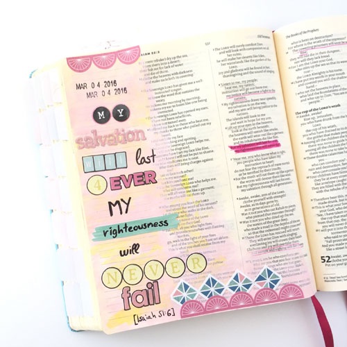 Do you have a set time of day or in your week set aside for Bible journaling, or does it just happen as and when you can fit it in? Actually no, it’s something that just happens. I set aside quiet time for reading scriptures or Christian books, where I find verses that really touch my heart and I write them in a special notebook, so when during the day (more often on weekends) I have 15 minutes for myself I grab my journaling Bible and a few supplies and just decorate the page of one of the verses of my notebook and write some journaling about It.
