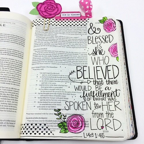 Please can you explain a bit about your process? I like to work at home, as I have all of my supplies ready to create there. I always pray before I start a page. Sometimes, the Lord will press a scripture upon my heart that I know I am meant to illustrate. Other times I will read until a scripture stands out as one I would like to illustrate.