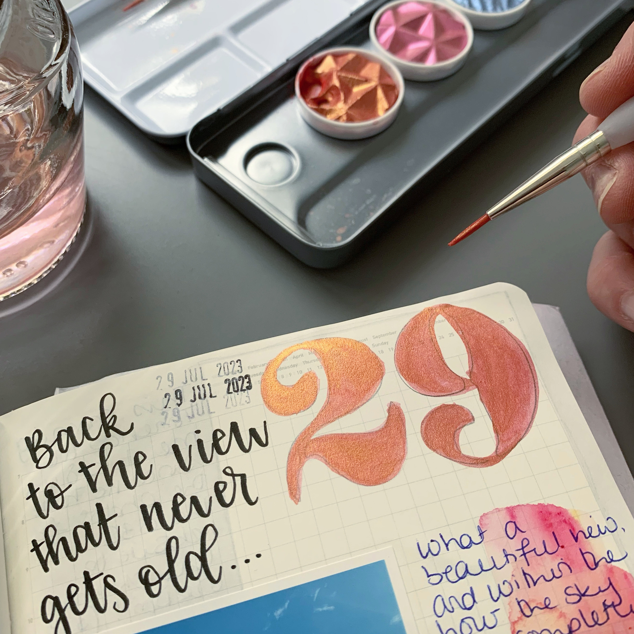 Back home after a few days away, I kept up with my journaling and thanks to my little Canon Selphy I printed photos each day – but it’s time to paint in all my numbers! I took my stencil (I designed it to easily slip in the back of my journal) so the numbers are all pencilled in and just need painting.