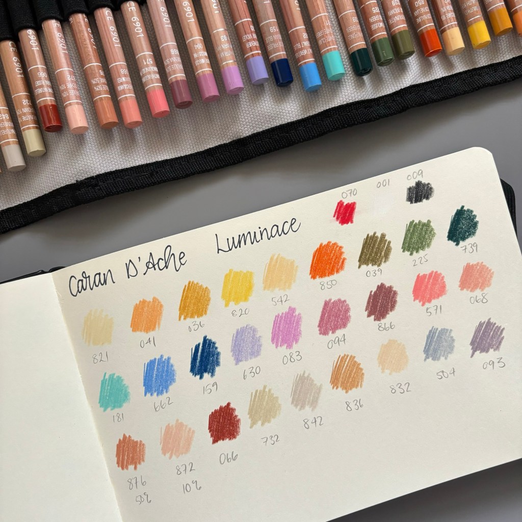 See, the swatches got more “relaxed” …eventually! The grid disappeared for the pencils 🙈🤣 (Tell me you’re uptight without telling me you’re uptight!) I really cannot recommend swatching, especially with a good friend and a cup of tea, enough… just watch you don’t put your paintbrush in your tea! 💛