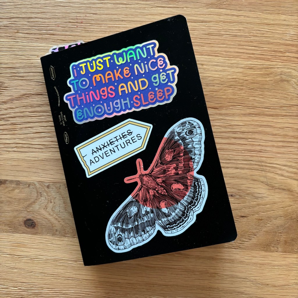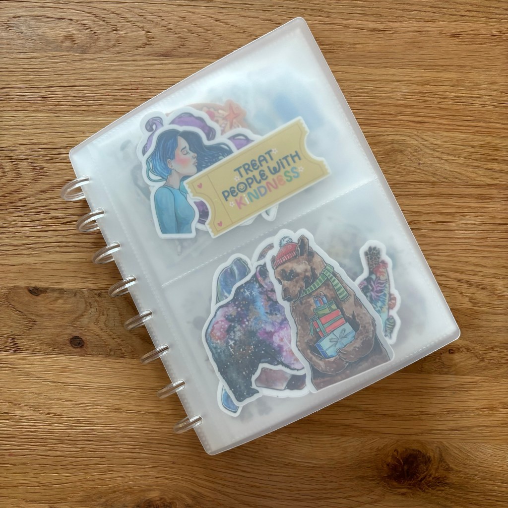 5. My sticker album. This slip album holds a lot of my fave vinyl stickers and also my fave PET tapes (I cut off one loop, then cut it into lengths that fit the width of the album). I use PET tape to decorate my pages, brighten up a boring page/day.