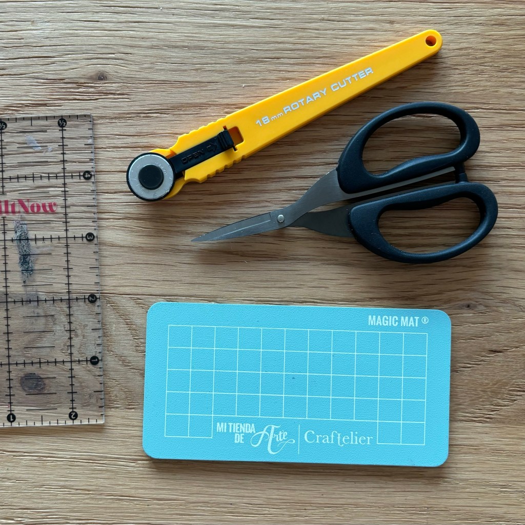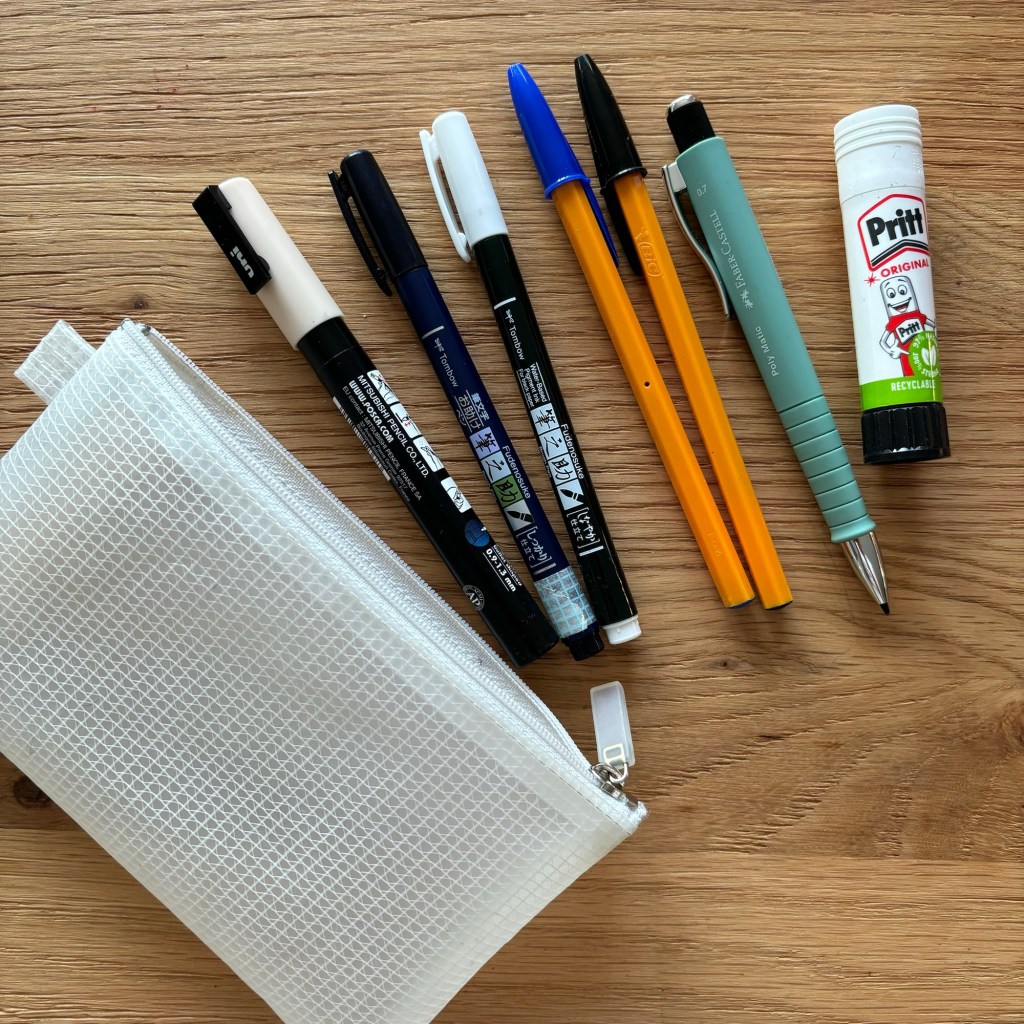 2. My small pink journaling pouch. Which is a Delfonics utility pouch, size small, measuring 195x142x55mm. Inside that you will find a smaller MUJI pencil pouch that has all my favourite pens and pencil in, plus a small glue stick. Also a teeny tiny cutting mat, and the smallest rotary cutter I own plus a tiny quilting ruler that came free on the front of a magazine. (These three things I use to chop down photos and ephemera.) Also a little pair of Tim Holtz snips. Having this small pouch packed with these things makes it very grabbable for journaling on the go! (I’d add in a selection from 4&5 to add in before I took it outside.)