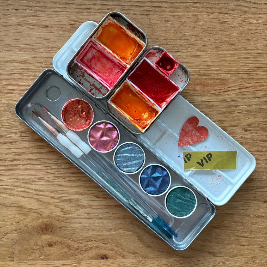 6. Watercolours. Personally I like to stencil big numbers for my journal entry date, and then paint them in with shimmery metallic watercolours. So there is metallic paint on my desk, along with the paint I use to prep my pages. (I find a paint plopped page less daunting to write on than a blank page.)